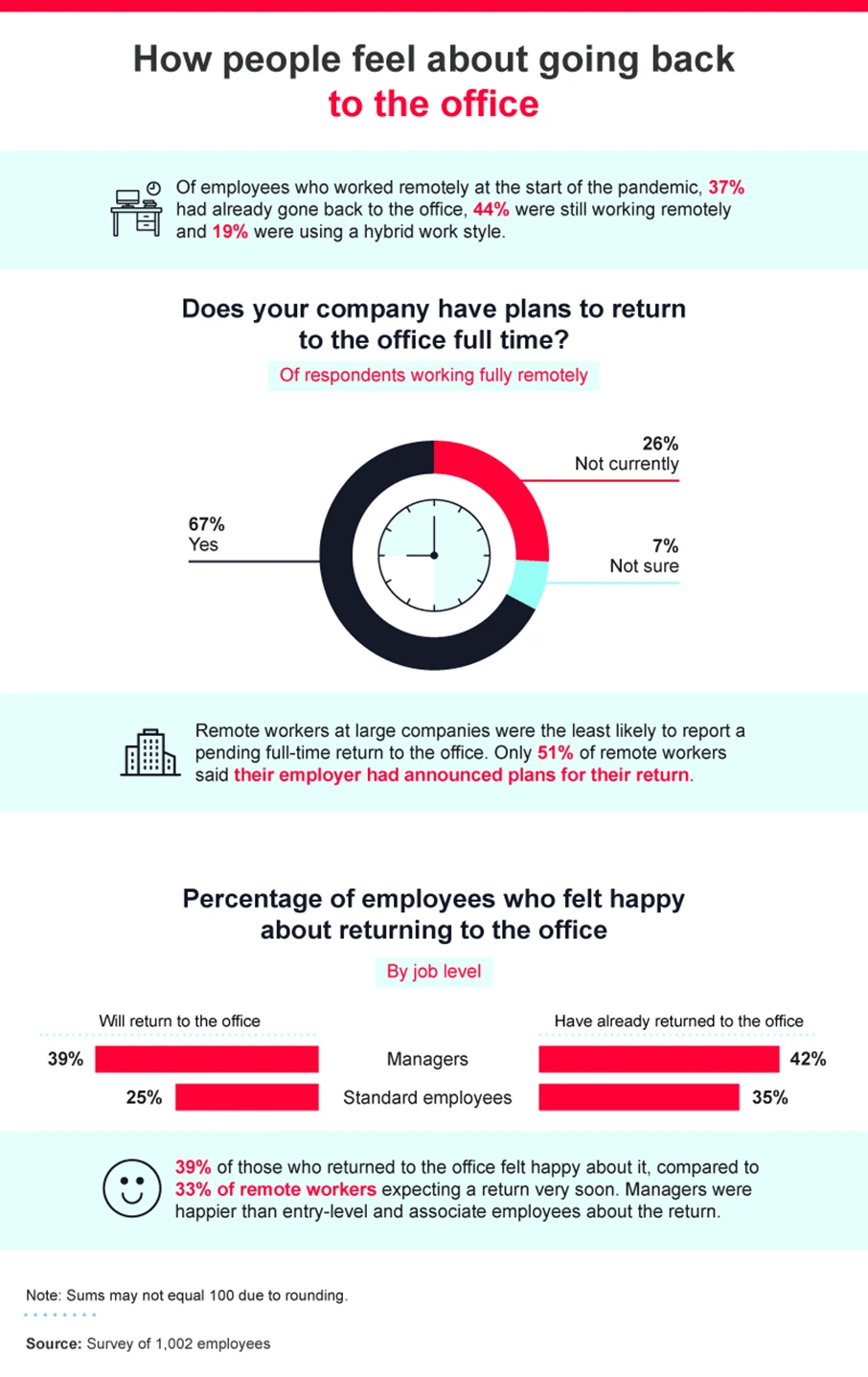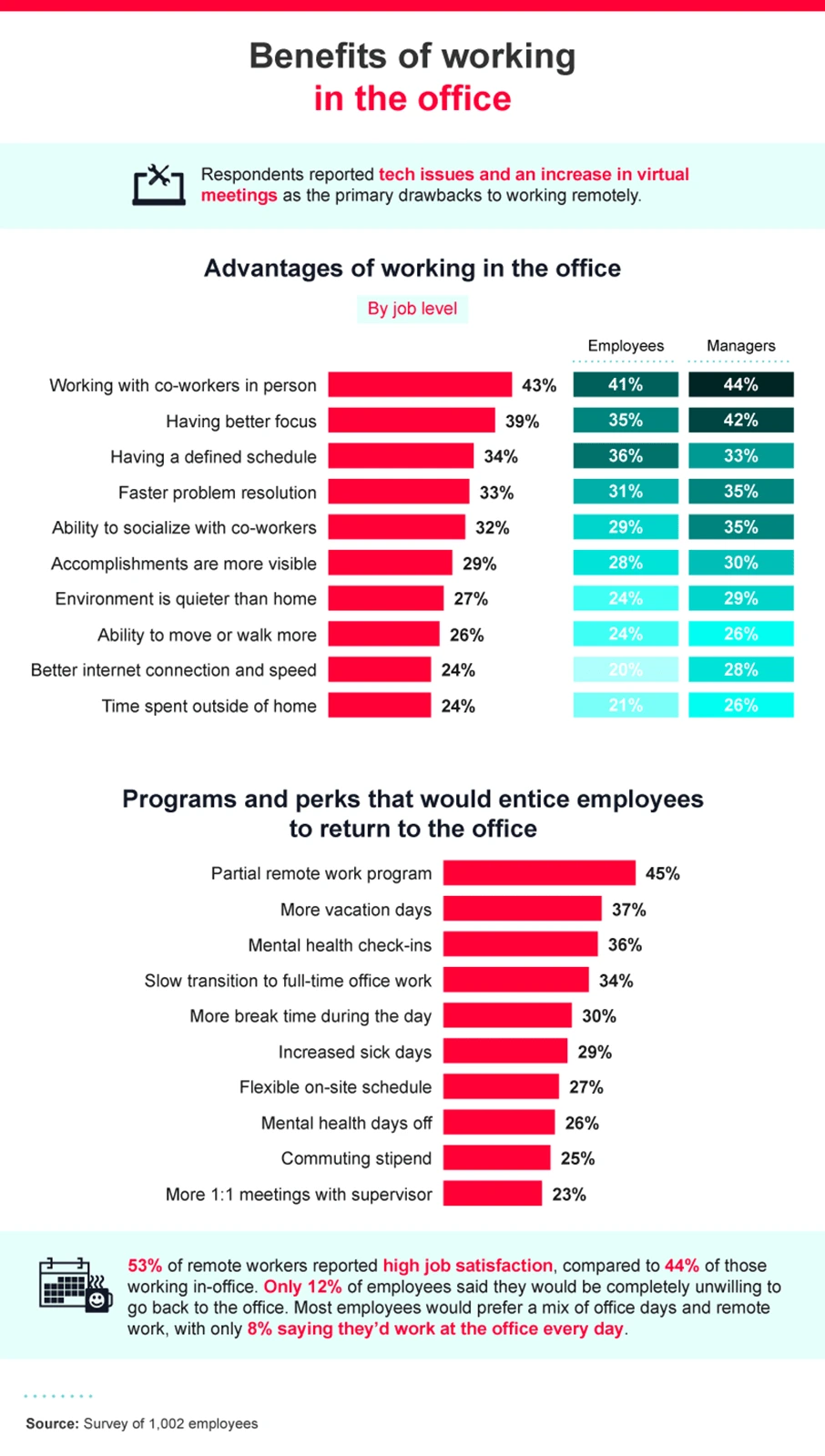 Americans’ feelings about working in the office are mixed. Workers who have already returned to the office were happier about returning than those who were anticipating returning soon (35% vs. 25%, respectively). Managers were also happier than entry-level and associate employees about returning (42% of managers that had returned reported feeling happy to be back).