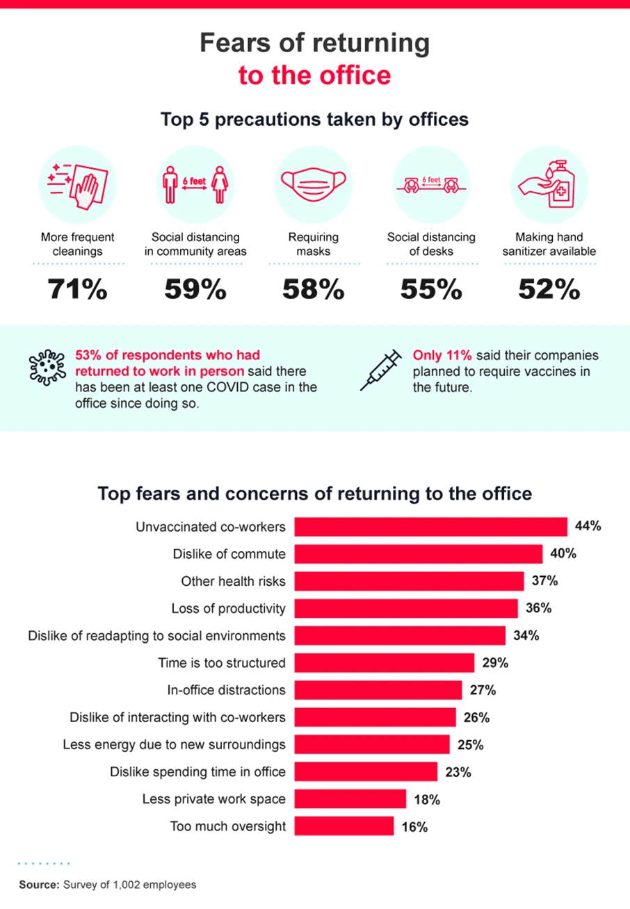 A major worry people have about returning to the office is the risk of illness. Forty-four percent of respondents were uneasy about working alongside unvaccinated co-workers. This fear is not unfounded because 53% of offices already have had at least one case of COVID-19. Employees are also worried about other health risks and a loss in productivity. Many people disliked the thought of returning to a regular commute, too.