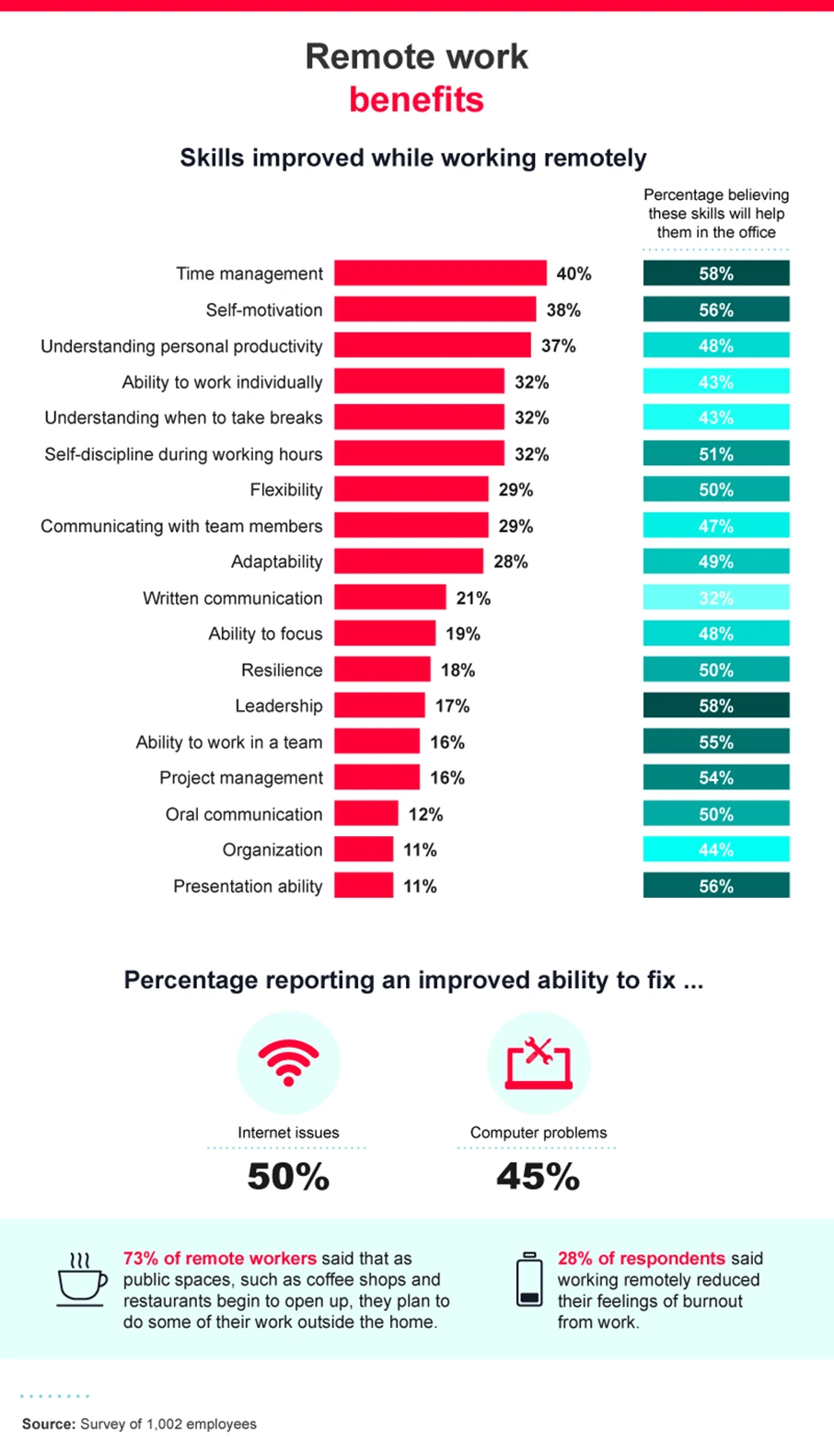 According to our study, the skill that most workers improved during remote work was time management, followed by self-motivation and a better understanding of when they’re most productive during the workday. Half of remote workers were also able to improve their ability to fix internet issues, while 45% got better at fixing computer problems on their own. Burnout from work was reduced for 28% of Americans, too.